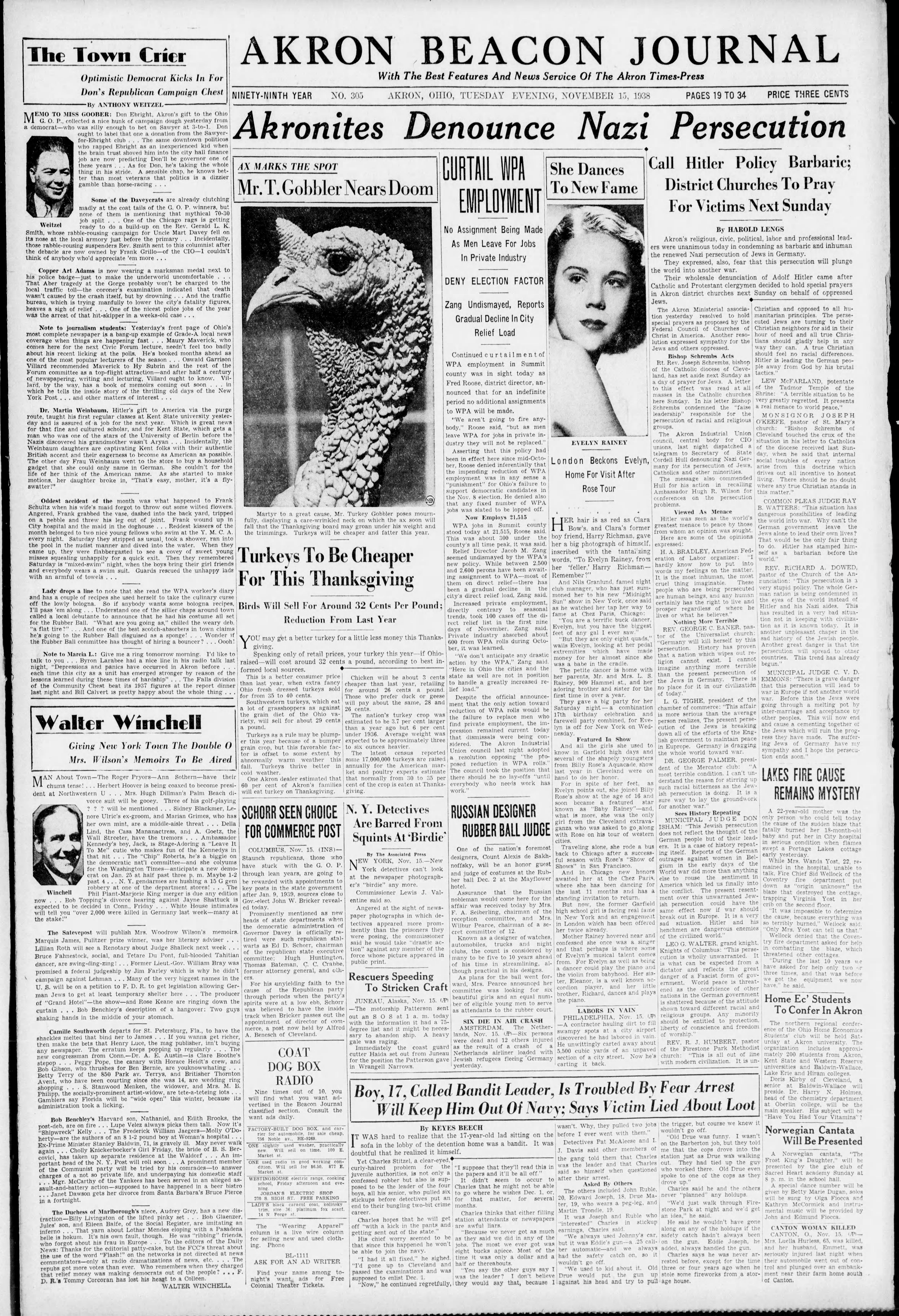 - Persecution RichmanRemember?" said to pedal made she with S. her the her and Eveoff Wednesday. to and show on as Billy and star only extravaganza along bus successful of honors Paris, for a fame offered and singer some comes being and sister, accordion little plays (P) fill airport vain. about he's Call Hitler Policy Barbaric; District Churches To Pray For Victims Next Sunday By HAROLD Akron's religious, civic, political, ers were unanimous today in the renewed Nazi persecution of They expressed, also, fear the world into another war. Their wholesale denunciation Catholic and Protestant clergymen in Akron district churches next Jews. The Akron Ministerial association yesterday resolved to hold special prayers as proposed by the Federal Council of Churches of Christ in America. Another resolution expressed sympathy for the Jews and others oppressed. Bishop Schrembs Acts Rt. Rev. Joseph Schrembs, bishop of the Catholic diocese of Cleveland, has set aside next Sunday as a day of prayer for Jews. A letter to this effect was read at all masses in the Catholic churches here Sunday. In his letter Bishop Schrembs condemned the "false leadership" responsible for the persecution of racial and religious groups. The Akron Industrial Union council, central body for CIO unions, last night dispatched a telegram to Secretary of State Cordell Hull denouncing Nazi of Jews, Germany for its persecution Catholics and other minorities. The message also commended Hull for his action in recalling Ambassador Hugh R. Wilson for conferences on the persecution problems. Viewed As Menace Hitler was seen as the world's greatest menace to peace by those from whom an opinion was sought. Here are some of the opinions expressed: H. A. BRADLEY, American Federation of Labor organizer: "I hardly know how put into words my feelings on the matter. It is the most inhuman, the cruel thing imaginable. These people who are being persecuted are human beings, and any human certainly has the right to live and regardless of where he prosper lives or what he believes." Nothing More Terrible REV. GEORGE C. BANER, pastor "Germany of the will Universalist, church: by this persecution. History has proven nation which wipes out rethat a cannot exist. I cannot ligion anything more terrible imagine than Jews the in present Germany. persecution. of is the no place for in our civilization of today." L. G. TIGHE, president of the chamber of commerce: "This affair is more serious than the average person realizes. The present persecution of Jews is breaking down all of the efforts of the English government to maintain peace in Euprope. Germany is dragging the whole world toward war. DR. GEORGE PALMER, president of the Mercator club: "A most terrible condition. I can't understand the reason for stirring up such racial bitterness as the Jewish persecution is doing. It is a sure way to lay the groundwork for another war." Sees History Repeating MUNICIPAL JUDGE DON ISHAM: "This Jewish persecution does not reflect the thought of the German people but of their leaders. It is a case of history repeating itself. Reports of the German outrages against women in Belin the early days of the gium World war did more than anything else to rouse the sentiment in America which led us finally into the conflict., The present resentment this unwarranted Jewish persecution could have the same effect now if war should break out in Europe. It is a very sad situation. Hitler and his henchmen are dangerous enemies of the civilized world." LEO G. WALTER, grand knight, Knights of Columbus: "This persecution is wholly unwarranted. It is what can be expected from a dictator and reflects the great danger of a Fascist form of government. World peace is threatas the confidence of other nations in the German government is shattered because of the attitude shown toward different racial and religious groups. Any minority should be entitled to protection, liberty of conscience and freedom of worship." REV. R. J. HUMBERT, pastor of the Firestone Park Methodist church: "This is all out of line with modern civilization. It is un- LENGS labor and professional leadcondemning as barbaric and inhuman Jews in Germany. that this persecution will plunge of Adolf Hitler came after decided to hold special prayers Sunday on behalf of oppressed Christian and opposed to all humanitarian principles. The persecuted Jews are turning to their Christian neighbors for aid in their hour of need and all true Christians should gladly help in any way they can. A true Christian should feel no racial differences. Hitler is leading the German people away from God by his brutal tactics." LEW McFARLAND, potentate of the Tadmor Temple of the Shrine: "A terrible situation to be very greatly regretted. presents a real menace to world peace." MONSIGNOR JOSEPH O'KEEFE, pastor of St. Mary's church: "Bishop Schrembs of Cleveland touched the crux of the situation in his letter to Catholics of the diocese received last Sunday, when he said that internal social troubles of every nation arise from this doctrine which drives out all incentive to honest living. There should be no doubt where any true Christian stands in this s matter." COMMON PLEAS JUDGE RAY B. WATTERS: "This situation has dangerous possibilities of leading the world into war. Why can't the German government leave the Jews alone to lead their own lives ? That would be the only fair thing to do. Hitler has stamped himself as a barbarian before the world." REV. RICHARD A. DOWED, pastor of the Church of the Annunciation: This persecution is 3 very stupid policy. The whole German nation is being condemned in the eyes of the world, instead of Hitler and his aides. This has resulted in a very bad situanot in keeping with civilization as it is known today. It is another unpleasant chaper in the sad history of the Jewish people. Another great danger is that the persecution will spread to other countries. This trend has already begun." MUNICIPAL JUDGE C. V. D. EMM
