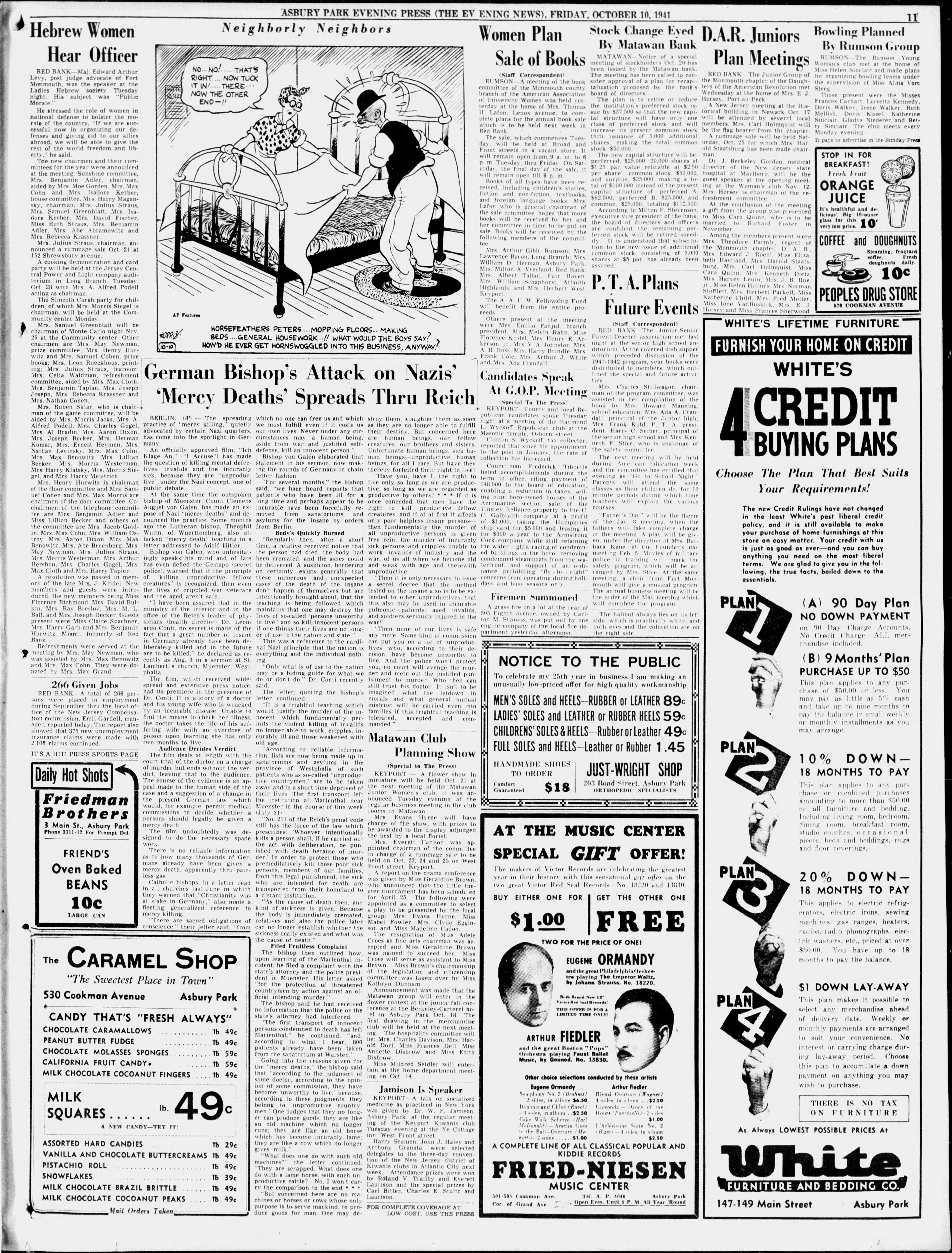 - German Bishop's Attack on Nazis' 'Mercy Deaths' Spreads Thru Reich BERLIN. (AP) - The spreading practice of "mercy killing,' advocated by certain Nazi quarters, has come into the spotlight in Germany. An officially approved film, "Ich Klage An,' ("I Accuse") made the question of killing mental defectives, invalids and the incurably sick. because they are "unproductive" under the Nazi concept, one of public debate. At the same time the outspoken bishop of Muenster, Count Clemens August von Galen, has made an expose of Nazi "mercy deaths" and denounced the practice. Some months ago the Lutheran bishop, Theophil Wurm, of Wuerttemberg, also attacked "mercy death" teaching in a addressed to Adolf Hitler. letter, von Galen, who unhesitatingly speaks his mind and of late has even defied the Gestapo (secret police), warned that if the principle "killing unproductive fellow creatures" is recognized. then even the lives of crippled war veterans and the e aged aren't safe. "I have been assured that in the ministry of the interior and in the office of the Reich's leader of physicians (health director) Dr. Leonardo Conti, no secret is made of the fact that a great number of insane in Germany already have been deliberately killed and in the future are to be killed." he declared as recently as Aug. 3 in a sermon at St. Lamberti's church, Muenster, Westphalia. The film, which received widespread and extensive press notice, had its premiere in the presence of Dr. Conti. It is a story of a doctor and his young wife who is wracked by an incurable disease. Unable to find the means to check her illness, the doctor takes the life of his suffering wife with an overdose of poison upon learning she has only two months to live. Audience Decides Verdict The film deals at length with the court trial of the doctor on a charge of murder but ends without the verdict, leaving that to the audience. The course of the evidence is an appeal made to the human side of the case and a suggestion of a change in the present German law which would, for example, permit medical commissions to decide whether a persons should legally be given a mercy death. The film undoubtedly was designed to do the necessary spade work. There is reliable information as to how many thousands of Gerre mans already have been given a mercy death, apparently thru painless gas. Catholic bishops, in a letter read in all churches last June in which they warned that "Christianity was at stake in also made a fleeting generalized' reference to mercy killing. "There are sacred obligations of conscience." their letter said, "from SHOP Place in Town" Asbury Park "FRESH ALWAYS" 16 49c . . . 16 49c SPONGES . ... 16 59€ CANDY• . . 16 59€ COCOANUT FINGERS . . 16 49€ .. lb. C 49. CANDY- TRY IT! 16 29€ BUTTERCREAMS 16 49€ 16 49c 16 39€ BRITTLE 16 49€ COCOANUT PEAKS 16 49€ Orders Taken- printing; be A. Siegel, Samuel Cochairmen committee on Goldin, Ostrov. memory introduced, Bulbeinia L. donated persons office Compensation manager. L. to C. of which no one can free us and which we must fulfill even if it costs us our own lives. Never under any circumstances may a human being, aside from war and justified selfdefense, kill an innocent person.' Bishop von Galen elaborated that statement in his sermon, now making the rounds of Germany in chain letter fashion. "For several months." the bishop said, "we hace heard reports that patients who have been ill for a long time and perhaps appear to be incurable have been forcefully removed from sanatoriums and asylums for the insane by orders from Berlin. Body's Quickly Burned "Regularly then, after a short time, a relative received notice that the person had died, the body had been cremated, and the ashes could be delivered. A suspicion, bordering on certainty, exists generally that these numerous and unexpected cases of the death of the insane don't happen of themselves but are intentionally brought about, that the teaching is being followed which maintains that one may destroy the lives of so-called 'persons unworthy to live.' and so kill innocent persons if thinks their lives are no longer of use to the nation and state.' This was a reference to the cardinal Nazi principle that the nation is everything and the individual nothing. "Only what is of use to the nation may be a biding guide for what we do or don't do," Dr. Conti recently said. The letter, quoting the bishop's letter, continued: is a frightful teaching which would justify the murder of the innocent, which fundamentally permits the violent killing of invalids no longer able to work, cripples, incurably ill and those weakened with old age. 'According to reliable information, lists are now being made up in sanatoriums and asylums in the province of Westphalia of such patients who as so-called "unproduc. tive countrymen,' are to be taken away and in a short time deprived of their lives. The first transport left the institution at Marienthal near Muenster in the course of this week (July 31). "No. 211 of the Reich's penal code still has the force of the law which prescribes: 'Whoever intentionally kills a person shall, if he carried out the act with deliberation, be punished with death because of murder.' In order to protect those who premeditatively kill those poor sick persons, members of our families, from this legal punishment, the sick who are intended for death are transported from their homeland to a distant institution. "As the cause of death then, any kind of sickness is given. Because the body is immediately cremated, relatives and also the police later can no longer establish whether the sickness really existed and what was the cause of death." Filed Fruitless Complaint The bishop then outlined how, upon learning of the Marienthal cident, he filed a complaint with the state's attorney and the police president in Muenster. His letter asked "for the protection of threatened countrymen by action against an official intending murder." The bishop