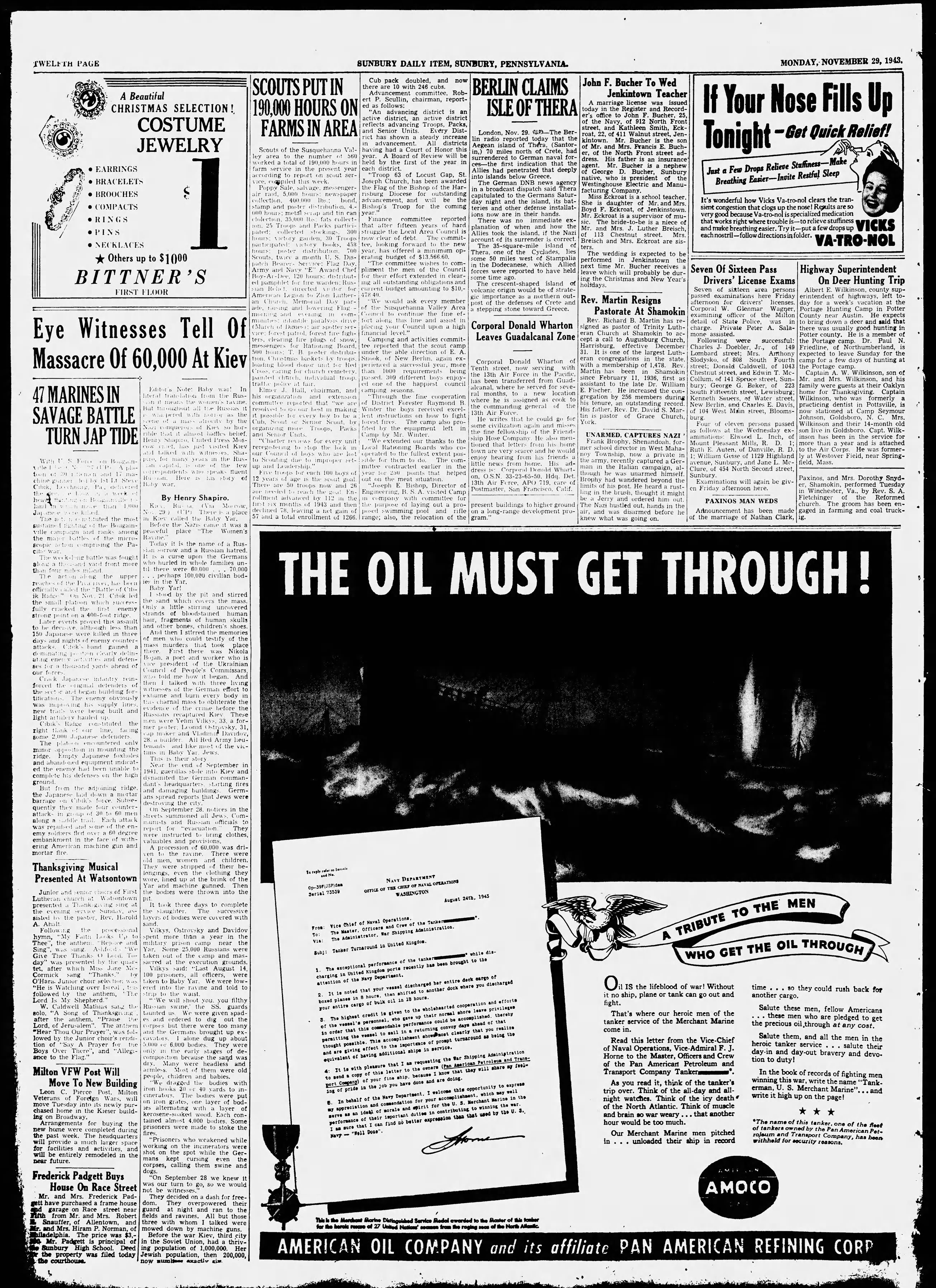 Eye Witnesses Tell Of Massacre Of 60,000 At Kiev 47 MARINES IN SAVAGE BATTLE TURN JAP TIDE With U S title I A platoon (; 20 11 and 17 Iliachine gunner lei by It It Steve Cab:k, Pa. delivered 1!:• 1. heavy land .0 1!:.1:1 1.000 Japane. e kated. The ant; u tituted the most sustained of the Bougainville camp.ugn and ranks among the major battles of microscopic action comprising the Pacitro war. The work-long battle was fought alone and vard front more than four males Inland. TI:e action along the upper reaches of the Pisa liver, has been officially called the "Battle of ('1b- ik Ridge" On Nov. 21. Cabik led the small platoon which successfully cracked the first enemy strong point on a 400-foot ridge. Later events proved this assault to be decisive. although less than 150 Japanese were killed in three days and nights of enemy counterattacks. (':bik's band gained a dominating dearly delinat.ng ener v act and defenses for a thousand yards ahead of our forces. Crack Japanese infantry reinforced the detenders of the sector and began building fortitication>. The enemy obviously was mposing his supply hines. new traits were being built and light a hauled up. Cibik'> Ridge constituted the right thank of our line, facing some 2.000 Japanese defenders. The platoon encountered only minor opposition in mounting the ridge. Empty Japanese foxholes and abandoned equipment indicated the enemy had been unable to complete his defenses on the high ground. But from the adjoining ridge. the Japanese laid down a mortar barrage 0l1 Cibik's force. Subsequently they made four counterattack- in group of 30 to 60 men along a saddle trail. Each attack was repulsed and some of the enemy soldiers fled over a 60 degree embankment in the face of withering American machine gun and mortar fire. Thanksgiving Musical Presented At Watsontown Junior and senior choirs of First Lutheran church at Watsontown presented a Thank: giving sing at evening Re Sunday. assisted by the pastor, Rev. Harold A. Ahalt. Following the processional hymn, "My Faith Looks Up to Thee", the anthem. "Rejoice and Sing", Was sung. A .d. •We Give 'Thee Thanks ( ) d. Today" was presented by the quartet, after which Miss Jane MeCormick sang "Thanks." by O'Hara. Junior choir selection was "He is Watching over Isical . followed by the anthem, •The Lord Is My Shepherd." W. Caldwell Mathias sand the solo, "A Song of Thanksgiving after the anthem, "Praise the Lord, of Jerusalem". The anthem *Hear Thou Our Prayer", was followed by the Junior choir's rendition of "Say A Prayer for the Boys Over There", and "Allegiance to the Flag." Milton VFW Post Will Move To New Building Leon C. Pierce Post. Milton Veterans of Foreign Wars, will move Tuesday into its newly purchased home in the Kieser building on Broadway. Arrangements for buying the new home weekre completed during the past The headquarters will provide a much larger space facilities and activities, and will be entirely remodeled in the pear future. Frederick Padgett Buys House On Race Street Mr. and Mrs. Frederick Padsett have purchased a frame house garage on Race street near Mitth from Mr. and Mrs. Robert Snauffer, of Allentown, and and Mrs. Hiram P. Norman, of hiladelphia. The price was $3,- Mr. Padgett is principal of Sunbury High School. Deed the property was filed today| the courthouse. Editor's Note: Baby war! In literal translation from the Rus4:11 11 meals the women's ravine. But 1:1: oughout all the Russias It win: pered with holler do svetic of mass atrocity by the N./1 of Kiet so horrible tat it almost bailey belief. Henry Shapno, United Press MosCO coot. has just visited Kiev and talked with witnesses. Shafor many years in the RusHill capital, 1. OlIO the few correspondents who speaks fluent Ru: 1. Here 15 HIS story of Baby war. By Henry Shapiro. Kirt. Kus It. (Via Mo: cow, No:. 29. ) (UP) There j. a place 11 Kiev called the Baby Yar. Before the Nazis came it was a peaceful place "The Women's Ravine." Today it is the name of it Rusion sorrow and a Russian hatred. 1. a curse upon the Germans who hurled in whole families until there were 60.000 . . . 70.000 perhaps 100,000 civilian bodlies in the Yar. Baby Yar! I stood by the pit and stirred the sand which covers the mass. Only a little stirring uncovered strands of bloodstained human hair, fragments of human skulls and other bones, children's shoes. And then I stirred the memories of men who could testify of the mass murders that took place there. First there was Nikola Bojan, poet and worker who is president of the Ukrainian Council of People's Commissars, who told me how it began. And then I talked with three living witnesses of the German effort to exhume and burn every body in charnal mass to obliterate the evidence of the crime before the Russians recaptured Kiey, These B.en were Yelim Vilkys, 33. a former porter: Leonid Ostrovsky. 31, cap maker and Vladmur Davidov, 28. a builder. All Red Army lieutenants and like most of the vicfinis 111 Baby Yar. Jews. This is their story Ne.r the end of September in 1941. guerillas stole into Kiev and dynamited the German commandant's headquarters. Starting tires and damaging buildings. Germans spread reports that Jews were destroying the city. On September 28. notices in the streets, and summoned Russian all Jews. officials Com- to report for "evacuation. They were instructed to bring clothes, valuables and provisions. A procession of 60,000 was driven to the ravine. There were old men, women and children. They were stripped of their belongings, even the clothing they wore, lined up at the brink of the Yar and machine gunned. Then the bodies were re thrown into the pit. It took three days to complete the slaughter. The successive layers of bodies were covered with sand. Vilkys, Ostrovsky and Davidov spent more than a year in the military prison camp near the Yar. Some 25.000 Russians were taken out of the camp and massacred at the execution grounds. Vilkys said: •Last August 14, 100 prisoners, all 
